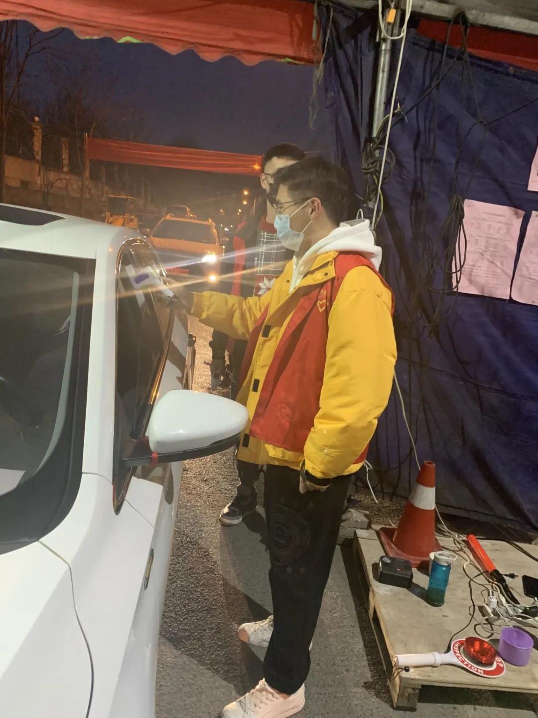 信息学院计科172徐凌云同学,作为新时代的大学生,积极参加防疫志愿者活动。协助乡镇干部设立检查站、关口,检查来往车辆以及行人的出入证明,并询问此次出入所去的场所及去该地的目的,同时给出入人员测量体温。我们这边采取两天一出入的规则,所以大部分人是去菜市场等地来满足日常生活需求。